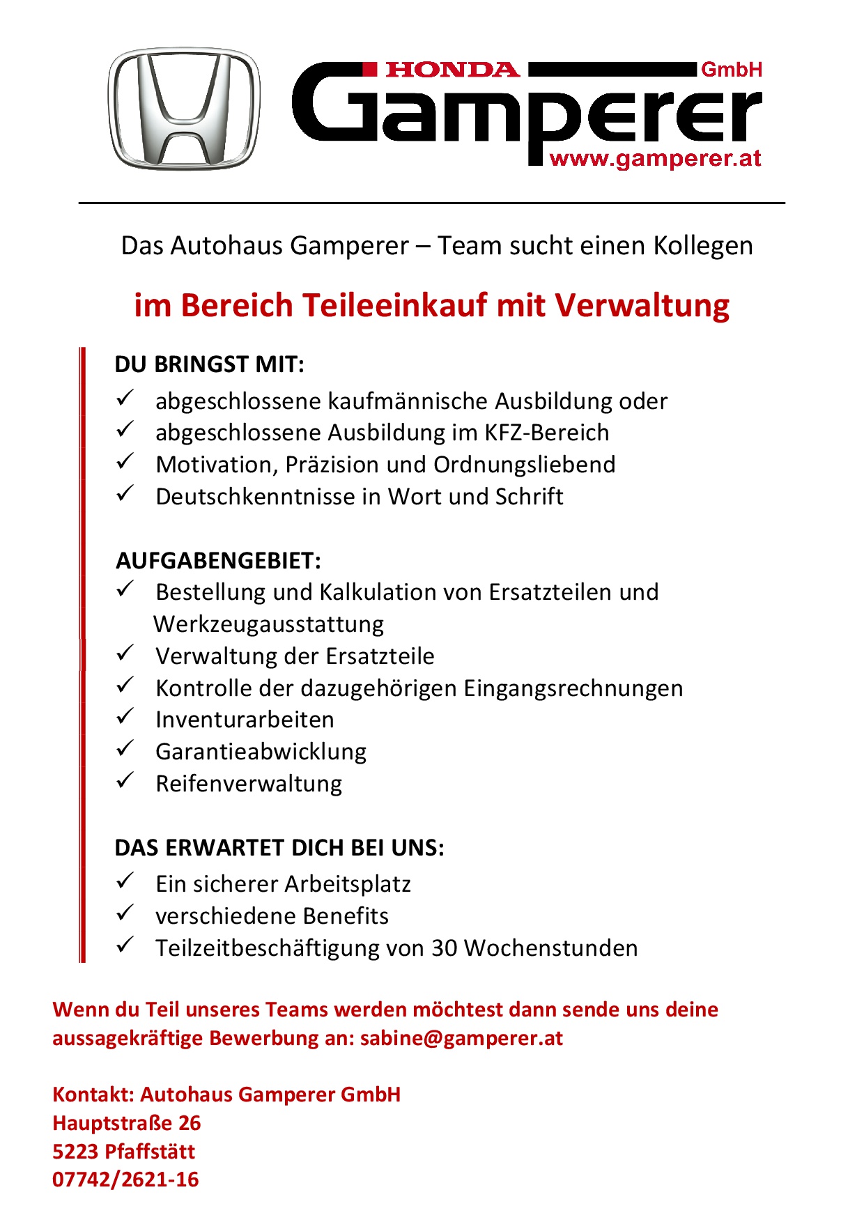 Wenn auch du von Autos fasziniert bist und du Teil unseres Teams werden möchtest dann sende uns deine aussagekräftige Bewerbung an: sabine@gamperer.at
