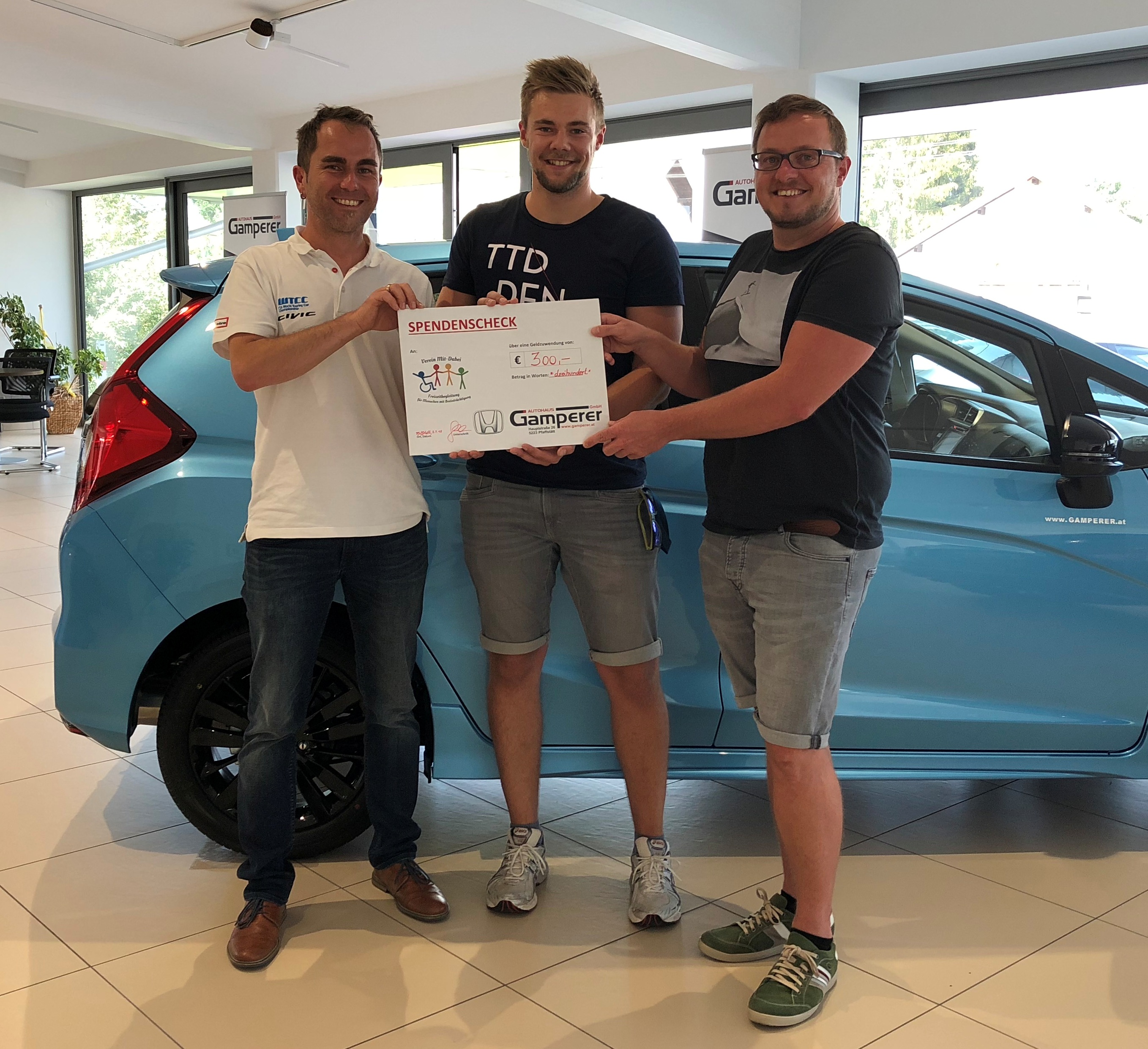 Gamperer Elmar Übergab die Spende an die Vereinsvorstände, Christian Kraus und Hubert Zillner.